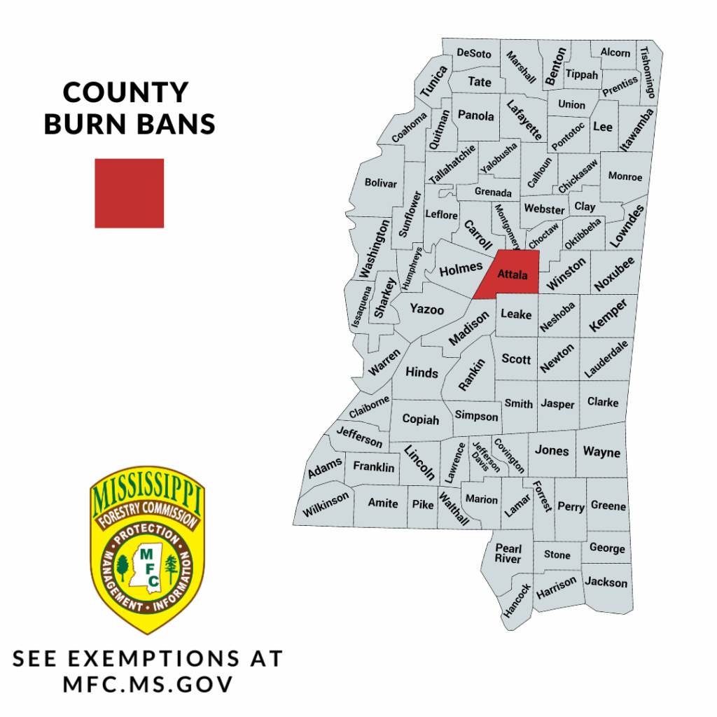 Burn bans are restrictions on outdoor burning during drought or wildfire conditions. The County Board of Supervisors normally requests burn bans, and the Mississippi Forestry Commission approves the requests. All burn bans expire at midnight on the stated date of expiration.